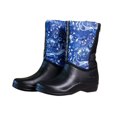 Сапоги женские. Представляют собой комбинированную модель, изготовленную на основе галоши из ЭВА, верх - из водоотталкивающей ткани, дублированной поролоном, и втачного утеплителя из искусственного меха. Температура тепла сохраняется до -30С. ЭВА прочный и при этом эластичный материал, сохраняющий свойства в морозную погоду. На поверхности не образуется грибок, ее легко отмыть от загрязнений обычной губкой и теплой водой. Модель выполнена на застежке-молнии сзади. Дизайн допускает использование как однотонных, так и цветных материалов.