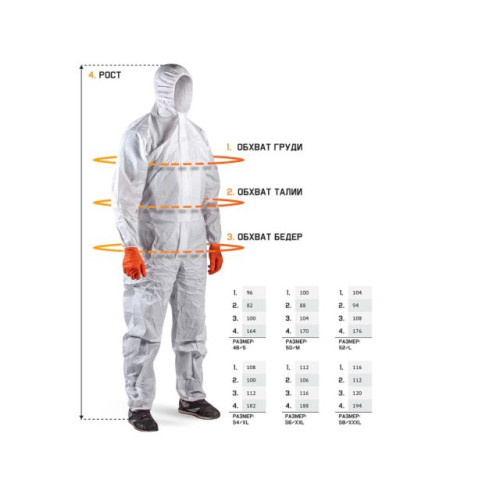 Легкий защитный комбинезон оснащен капюшоном, имеет комфортную посадку по фигуре, не сковывает движения во время рабочего процесса. Надевать комбинезон можно даже поверх обычной одежды, при этом пользователю гарантируется полная безопасность его гардероба. Гипоаллергенный нетканый материал (спанбонд) изделия очень легок и при этом довольно прочен. Спанбонд хорошо пропускает воздух, позволяя коже дышать, и не вызывает дискомфорта во время ношения. Он устойчив к высокой влажности, не поддается стиранию, выдерживает серьезные перепады температур и не накапливает статического электричества.