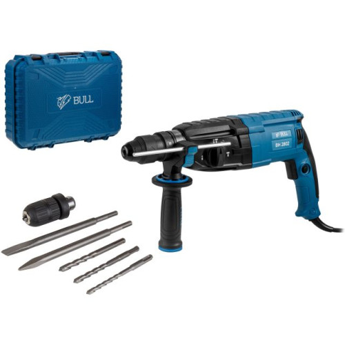Перфоратор BULL BH 2802 в чем. 850 Вт, 3.2 Дж, 28 мм, 4 реж. + 2 зубила, 3 сверла, БЗП в комплекте
