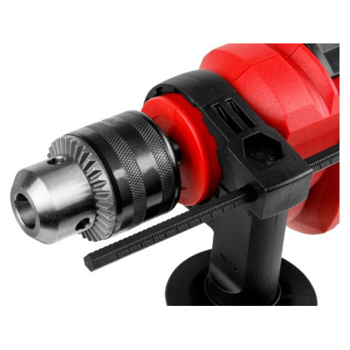 Дрель имеет медную обмотку двигателя и металлический сверлильный патрон. Дополнительная рукоятка обеспечивает надежный захват, имеется регулировка скорости, ограничитель глубины, реверс и блокировка кнопки включения.