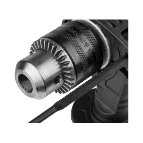 Дрель имеет медную обмотку двигателя, надежный металлический сверлильный патрон, дополнительная рукоятка обеспечивает захват, имеется регулировка скорости, ограничитель глубины, реверс и блокировка кнопки включения,