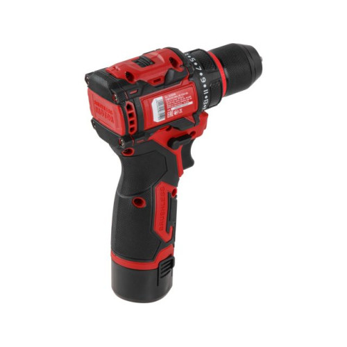 Для удобства пользователя предусмотрены светодиодная подсветка рабочей зоны, прорезиненная рукоятка и индикатор уровня заряда. Комплект включает два аккумулятора, зарядное устройство и прочный кейс, что делает инструмент удобным для транспортировки и непрерывной работы. Малый вес дрели-шуруповерта обеспечивает комфорт при длительном использовании.