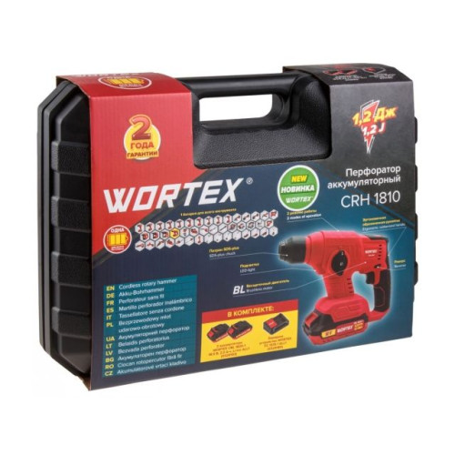 Модель имеет бесщеточный двигатель, что продлевает срок службы инструмента в 2 раза, делает его на 30% мощнее при меньших размерах и весе, позволяет работать до 50% дольше на одном заряде аккумулятора. Малый вес и компактные размеры делают данный перфоратор незаменимым при работе в труднодоступных местах без внешнего источника питания. В компактности превосходит все модели линейки перфораторов Wortex. Имеет два режима работы: сверление, сверление с ударом. Оснащен подсветкой, реверсом, эргономичной прорезиненной рукояткой. В комплекте 2 аккумулятора и зарядное устройство.