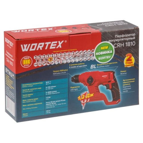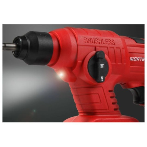 Модель имеет бесщеточный двигатель, что продлевает срок службы инструмента в 2 раза, делает его на 30% мощнее при меньших размерах и весе, позволяет работать до 50% дольше на одном заряде аккумулятора. Малый вес и компактные размеры делают данный перфоратор незаменимым при работе в труднодоступных местах без внешнего источника питания. В компактности превосходит все модели линейки перфораторов Wortex. Имеет два режима работы: сверление, сверление с ударом. Оснащен подсветкой, реверсом, эргономичной прорезиненной рукояткой.
