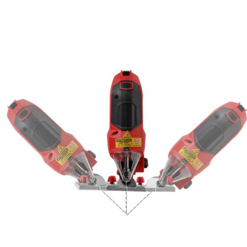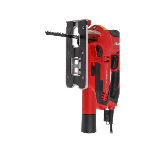 Лобзик оснащен удобной, эргономичной прорезиненной рукояткой, для быстрой замены пильных полотен предусмотрен быстрозажимной патрон. Наличие маятникового движения с направляющим роликом позволяет производить быстрые и при этом ровные пропилы. Литая алюминиевая подошва регулируется под разными углами. Возможно подключение пылесоса. Регулировка скорости позволяет использовать лобзик для реза различных материалов. Есть лазерный указатель и подсветка. Есть сдув опилок.