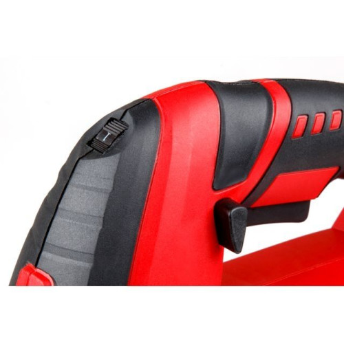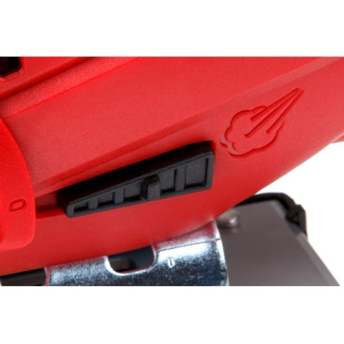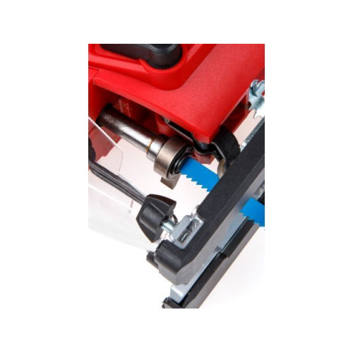 Лобзик оснащен удобной, эргономичной прорезиненной рукояткой, для быстрой замены пильных полотен предусмотрен быстрозажимной патрон, наличие маятникового движения с направляющим роликом, позволяет производить быстрые и при этом ровные пропилы. Литая алюминиевая подошва регулируется под разными углами. Есть защитная пластиковая накладка для подошвы. Возможно подключение пылесоса. Регулировка скорости позволяет использовать лобзик для реза различных материалов. Есть лазерный указатель и подсветка. Есть сдув опилок.