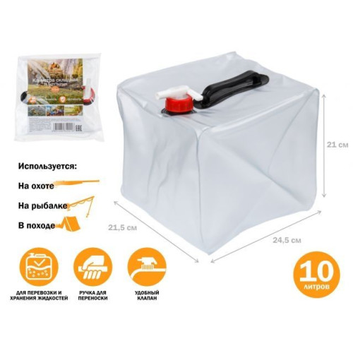 Складная канистра для воды с краном 10л ТМ ARIZONE предназначена для перевозки и хранения жидкостей в условиях похода или дальней поездки на автомобиле. Конструкция канистры позволяет компактно складывать её, а при необходимости заливать до 10 л жидкости. Надёжная пластиковая ручка для удобства переноски. Благодаря удобной крышке с краном канистра может использоваться как умывальник.