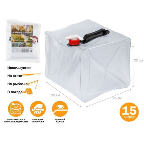 Складная канистра для воды с краном 15л ТМ ARIZONE предназначена для перевозки и хранения жидкостей в условиях похода или дальней поездки на автомобиле. Конструкция канистры позволяет компактно складывать её, а при необходимости заливать до 15 л жидкости. Надёжная пластиковая ручка для удобства переноски. Благодаря удобной крышке с краном канистра может использоваться как умывальник.