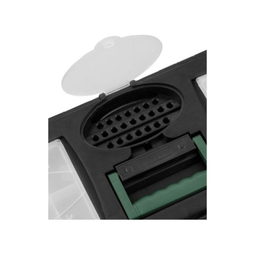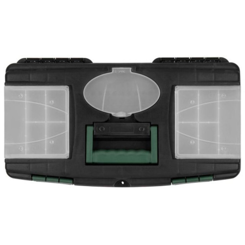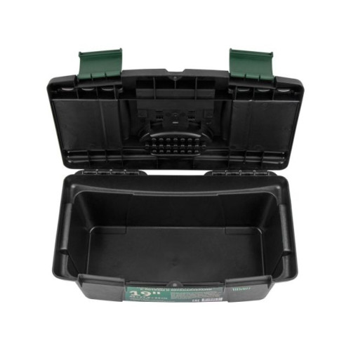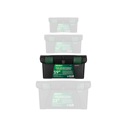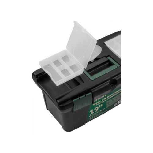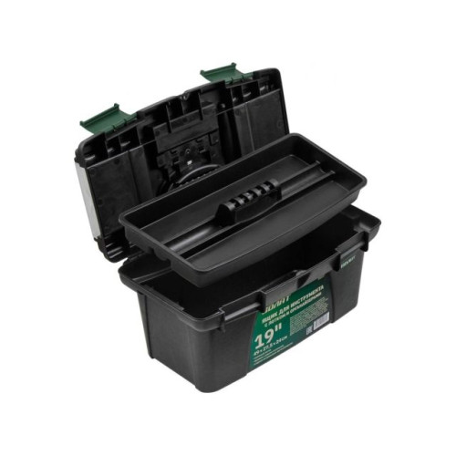 Ящик предназначен для хранения и удобной транспортировки инструментов. Подвижный лоток и два съемных органайзера на крышке позволяют разместить необходимые инструменты и аксессуары. Ящик надежно закрывается с помощью защелок.