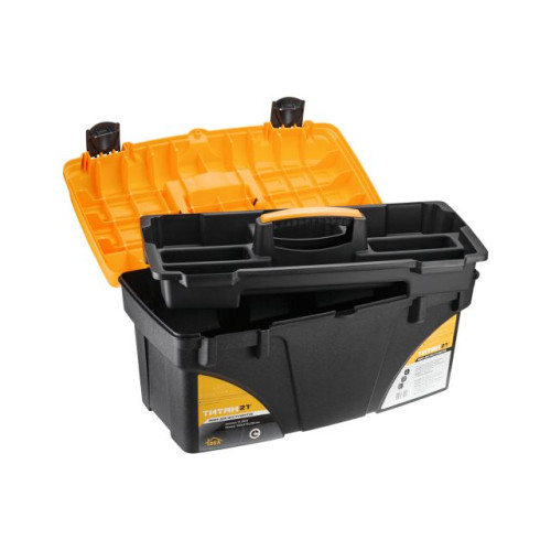 Ящик для инструментов с вкладышем и замками изготовлен из прочного безопасного пластика. Модель учитывает все нюансы для удобства переноски инструментов, в ящике предусмотрены: