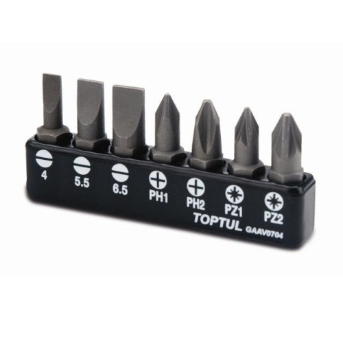 Набор бит Toptul из 7 принадлежностей, содержащий ассортимент бит для выполнения наиболее распространенных операций заворачивания и отворачивания.