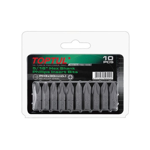 Насадка крестообразная PH1 30 мм 516 10 штук TOPTUL (FSBA1001G) - сменная насадка для работы с крепежом, имеющим крестообразное углубление PH. Изготовлены из стали S2. Покрытие - цинковое фосфатирование.