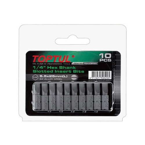 Бита SL5,5x1,0x25 мм 10 штук TOPTUL (FSAA085EG) используется в качестве сменной насадки при работе с крепежом, имеющим плоский шлиц. Изготовлены из стали S2. Покрытие - цинковое фосфатирование.