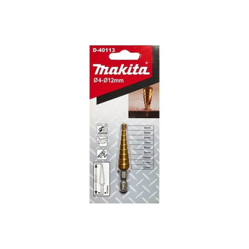 Сверло ступенчатое по металлу Makita TiN 4-12 мм (D-40113). Они покрыты специальным химическим соединением титана и азота,которое обеспечивает низкое трение.Данные свёрла характеризуются длительным сроком службы, высокой прочностью и антикоррозионной стойкостью, более высокой скоростью сверления и используется совместно с дрелями при выполнении сквозных отверстий в листовой стали и в цветных металлах. Оснастка оптимально подходит для обработки тонких листов, без деформаций. Главная особенность сверла - это его ступенчато-спиральный профиль, за счет чего можно получить различные по диаметру отверстия (от 4 до 12 мм), не меняя каждый раз оснастку. Применяют и для расширения уже существующих отверстий. Хвостовик сверла - 14.