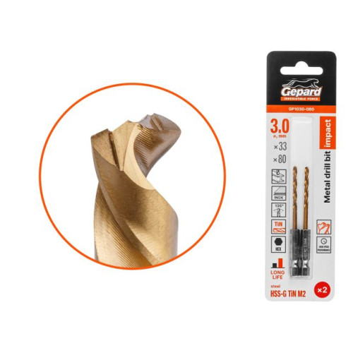 Сверло по металлу шестигр. 3.0х33х80 мм HSS-G TIN, комплект из 2-х шт GEPARD