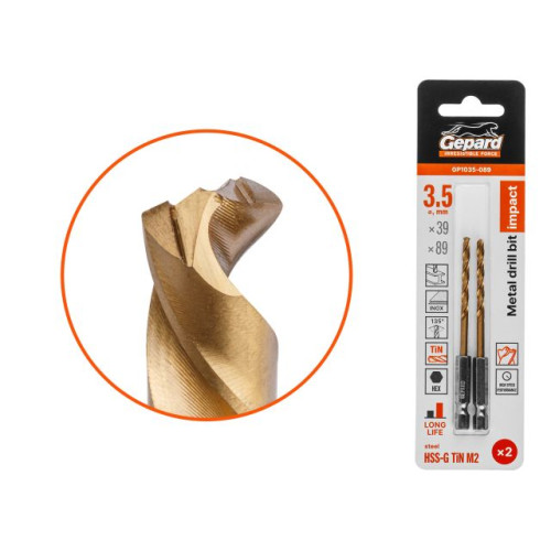 Сверло по металлу шестигр. 3.5х39х89 мм HSS-G TIN, комплект из 2-х шт GEPARD
