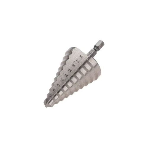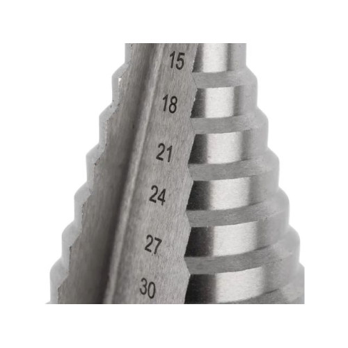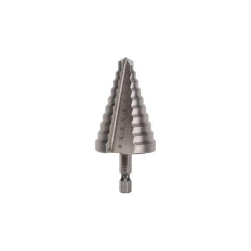 На каждой из 10 ступеней сверла нанесена маркировка фактического диаметра. Диапазон ступеней: 9, 12, 15, 18, 21, 24, 27, 30, 33, 36 (шаг 3 мм).