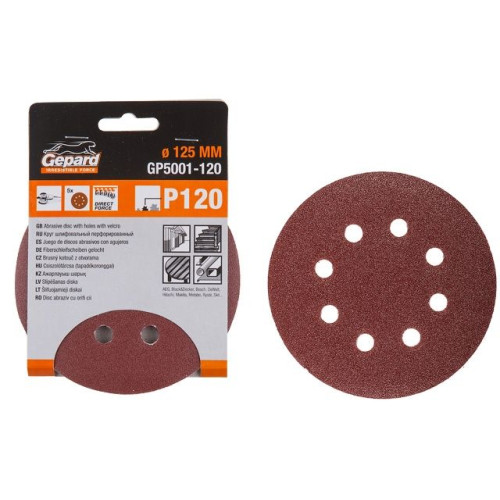 Схожий товар (без отверстий): GP5014-80 Шлифлист 125мм круг Р80 ддерева 5шт. GEPARD (GP5014-80)