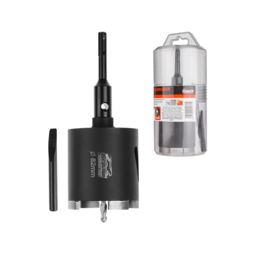 Комплект: коронка с алмазными сегментами, направляющее центрирующее сверло по бетону, держатель для коронки с хвостовиком SDS-plus, клин для выбивания центрирующего сверла из державки,