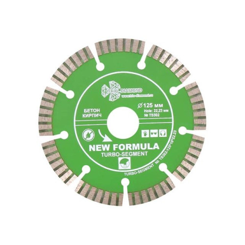 Диск сочетает в себе лучшие качества дисков Turbo (скорость реза и дополнительное охлаждение) и Segment (повышенная износостойкость). Не нуждается в дополнительном охлаждении водой. Примееняется для резки железобетона, бордюрного камня, мрамора, тротуарной плитки, шматочного кирпича и других высоко-, среднеабразивных, абразивных материалов.