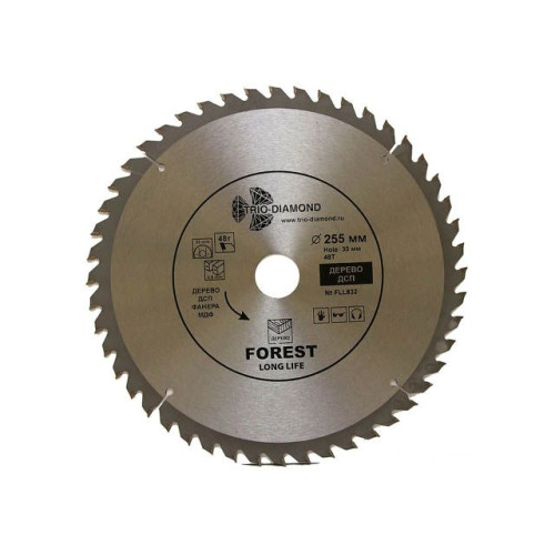 Диск пильный 255х30 мм 48 зубьев TRIO-DIAMOND Forest Long Life (FLL832) предназначен для распила древесины, ДСП, фанеры. Угол заточки 15 градусов. Максимальное число оборотов 5800 RPM.