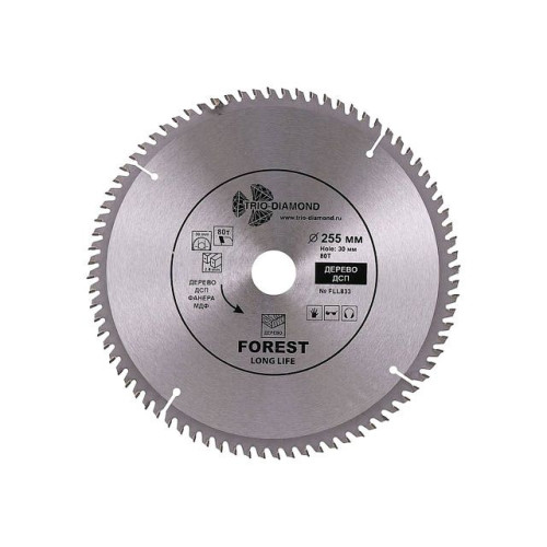 Диск пильный 255х30 мм 80 зубьев TRIO-DIAMOND Forest Long Life (FLL833) предназначен для распила древесины, ДСП, фанеры. Угол заточки 15 градусов. Максимальное число оборотов 5800 RPM.