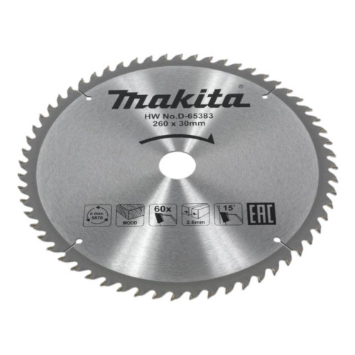 Пильный диск по дереву Makita Standard с твердосплавными напайками. Диаметр 260 мм, посадочное отверстие 30 мм, 60 зубьев. Толщина диска - 1.8 мм.