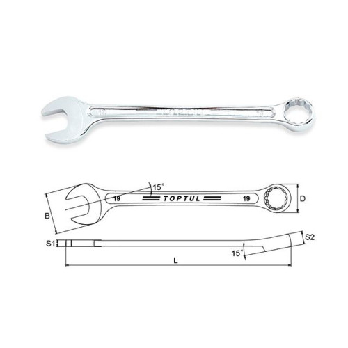 Ключ комбинированный TOPTUL имеет окончание в виде рожкового ключа с одной стороны и окончание в виде накидного ключа с 15 смещением по отношению к рукоятке с другой стороны.
