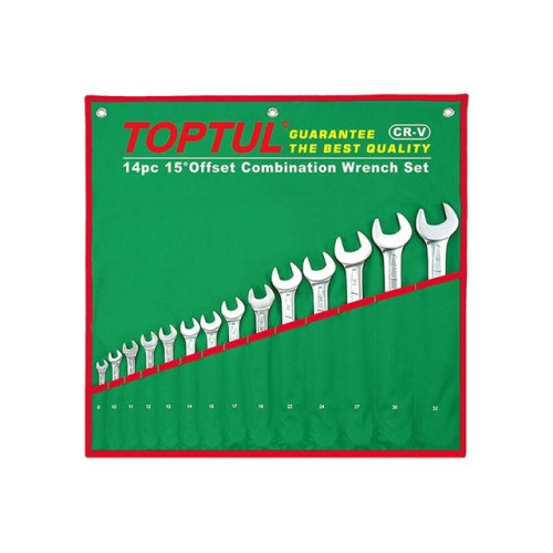 Набор ключей комбинированных TOPTUL состоит из 16 предметов размером 7, 8, 9, 10, 11, 12, 13, 14, 15, 17, 19, 22, 24, 27, 30 и 32 мм серии AAEB0707-3232, имеющих окончание в виде рожкового ключа с одной стороны и окончание в виде накидного ключа с другой стороны.