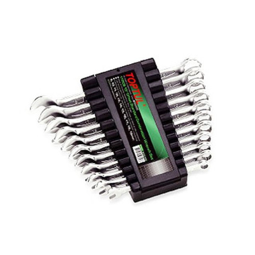 Набор ключей комбинированных на клипсе TOPTUL изготовлен из высокопрочной стали стойкой к коррозии и состоит из 11 предметов размером 8, 10, 11, 12, 13, 14, 15, 16, 17, 18 и 19 мм серии AAEB0808-1919, имеющих окончание в виде рожкового ключа с одной стороны и окончание в виде накидного ключа с другой стороны.
