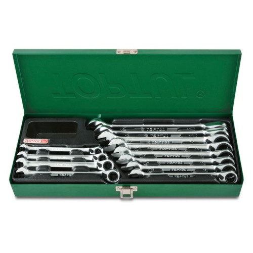 Профессиональный набор из 12 комбинированных ключей с переключаемой трещоткой TOPTUL PRO SERIES GAAD1205 в металлическом кейсе.