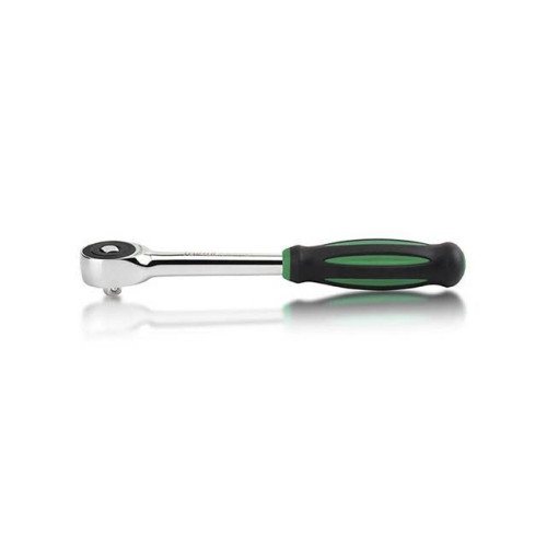 Трещотка снабжена колесом с 60 зубьями (для меньшего угла свободного хода), имеет переставной квадрат (для левого или правого вращения) и вращающуюся рукоятку для работы в труднодоступных, узких местах (возможность кручения квадрата осевым вращениям рукояти).