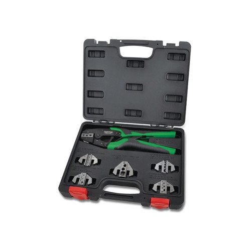 Набор для обжимки клемм универсальный. Уникальная конструкция механизма клещей обеспечивает полную обжимку. Храповый механизм упрощает работу и экономит время. Быстрая смена вставок без применения какого-либо инструмента. Эргономичная удобная рукоятка. Качественный набор инструментов для обимки клемм, пригодный для электриков различных специализаций.