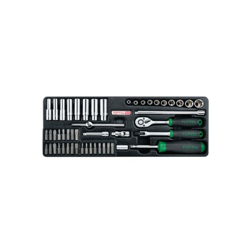 Набор инструмента TOPTUL GCAT5003 состоит из 50 единиц и включает в себя торцевые 6-гранные короткие головки от 3/16 до 9/16мм, длинные головки от 7/32 до 1/2мм, удлинители 50 и 150мм, вороток с плавающей головкой, вороток-отвертку, вороток с шарниром, трещотку на 36 зубцов, кардан и насадки HEX (3,4,5,6,8мм), TORX (T8,T10,T15,T20,T25,T27,T30,T40), PH (PH1, PH2, PH3), PZ (PZ1, PZ2, PZ3), SL (3, 4.5, 5.5, 6.5, 8мм).