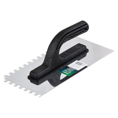 Гладилка из нержавеющей стали с пластиковой ручкой предназначена для разравнивания строительной или клеевой смеси. Полотно с зубьями 8х8 мм изготовлено из нержавеющей стали, стойкой к возникновению коррозии. Инструмент обладает удобной для удержания рукояткой.