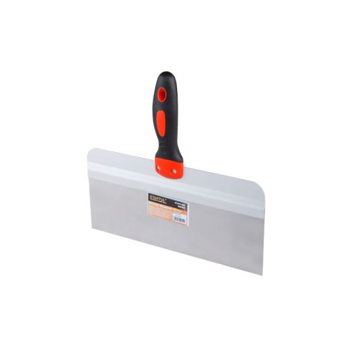 Фасадный шпатель - инструмент первой необходимости для специалиста по отделке и ремонту. Ровное жесткое полотно позволяет получать идеальный результат при нанесении шпатлевки или штукатурки на стены. Материал шпателя - нержавеющая сталь - не боится даже агрессивных сред, благодаря чему шпатель прослужит долго.