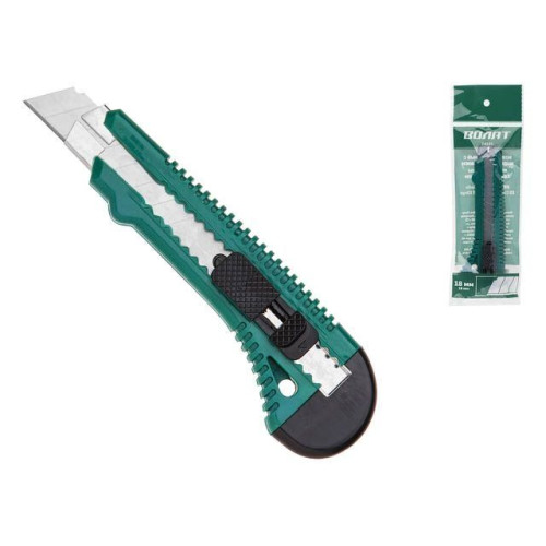 Тип корпуса: пластмассовый корпус, металлическая направляющая, кнопки выдвижения и механизм автоматической фиксации сменного лезвия,