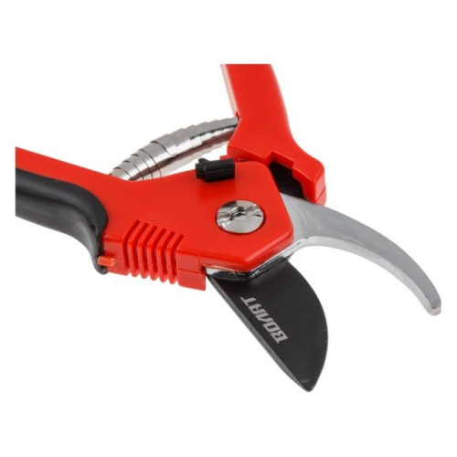 Описание: секатор оснащен резиновой накладкой на верхней рукоятке и боковым фиксатором,