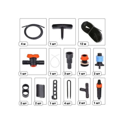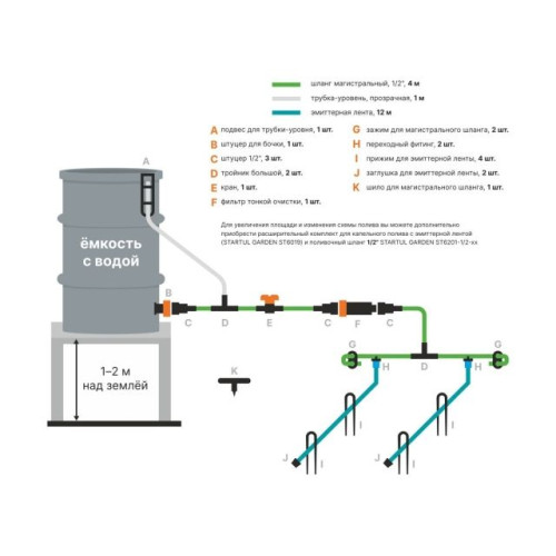 Комплект поставки: шланг магистральный 12 (4м.), трубка-уровень, прозрачная (1м.), эмиттерная лента (12м.), подвес для трубки-уровня (1шт.), штуцер для бочки (1шт.), штуцер 12 (3шт.), тройник большой (2шт.), кран (1шт.), фильтр тонкой очистки (1шт.), зажим для магистрального шланга (2шт.), переходный фитинг (2шт.), прижим для эмиттерной ленты (4шт.), заглушка для эмиттерной ленты (2шт.), шило для магистрального шланга (1 шт.)., руководство по эксплуатации,