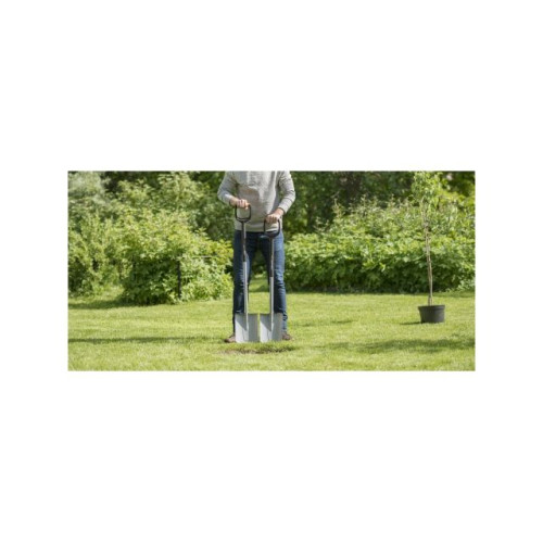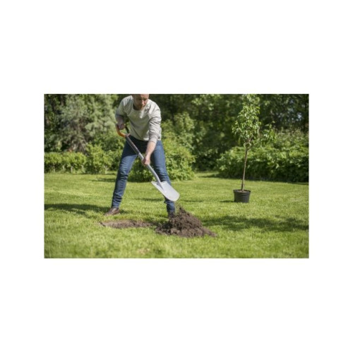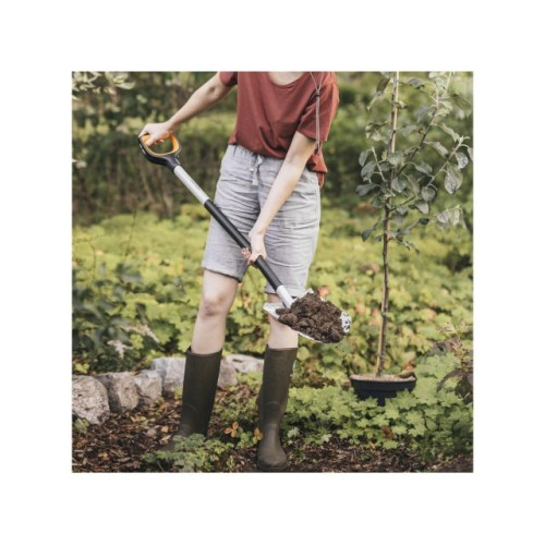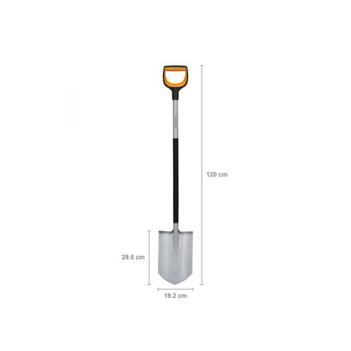 Садовая лопата. Материал лопаты - закаленная сталь с антикоррозийным покрытием. Материал черенка - полиамид, укрепленный стекловолокном. Рукоятка окрашена в стильный и яркий оранжевый цвет, чтобы избежать потери инвентаря. Фрикционная поверхность рукоятки позволяет выполнять любые виды садовых работ и удобно держать ее в руках. Для надежной фиксации черенка и лопаты специалисты компании Fiskars применяют новаторский тип сварки. Длина инструмента составляет 1,2 м.