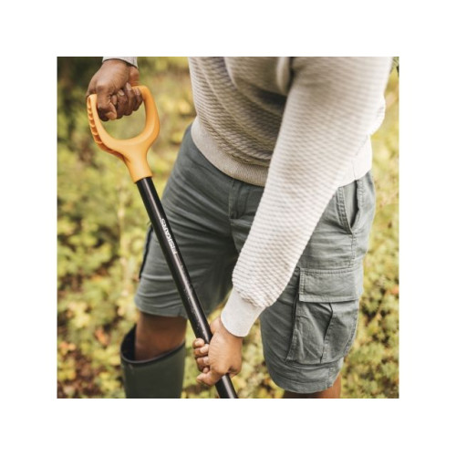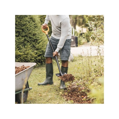 Лопата имеет широкий ковш для перемещение грязи, песка, гравия и других сыпучих материалов. Его стальная голова приварен к прочному металлическому валу для дополнительной прочности. D-образная