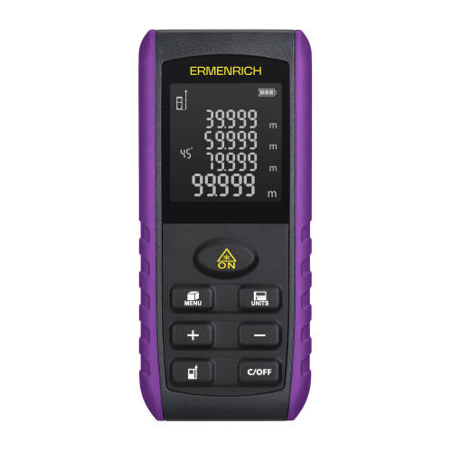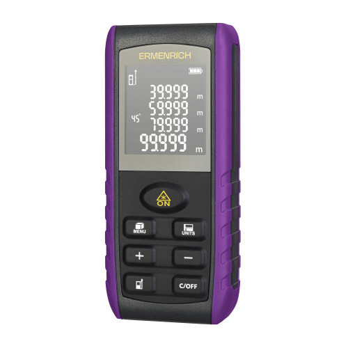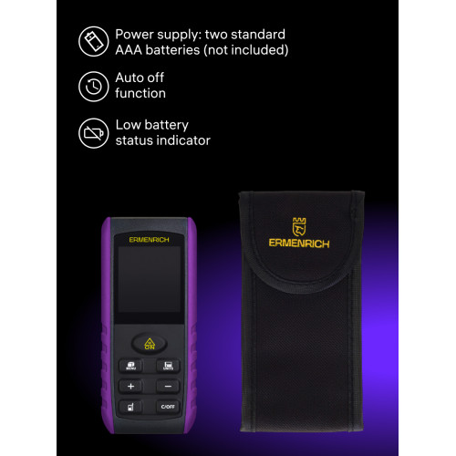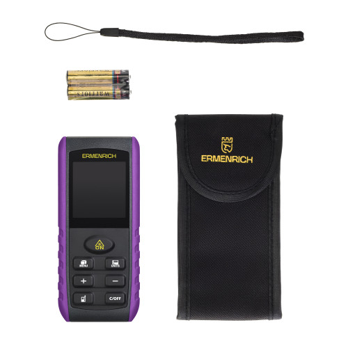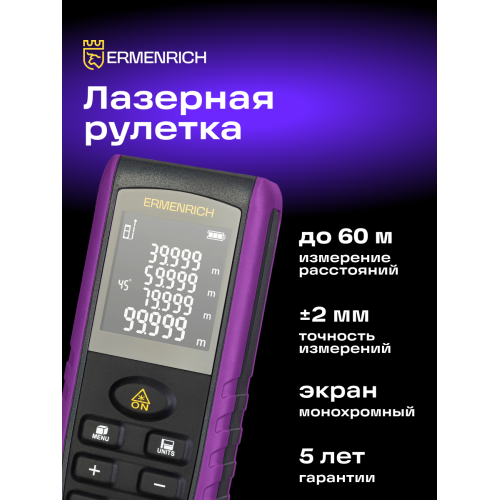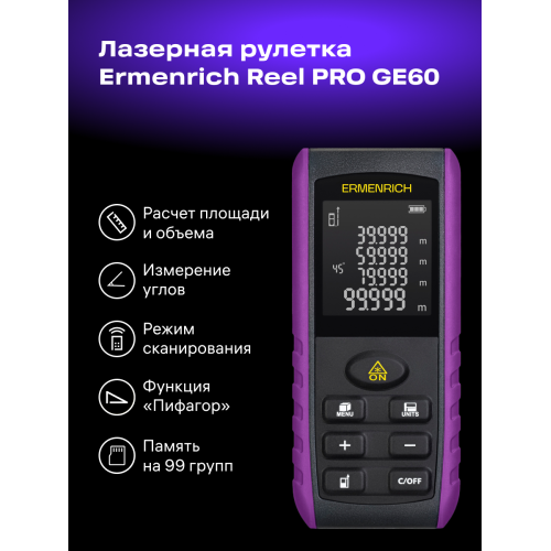 Лазерная рулетка Ermenrich Reel PRO GE60 – многофункциональное устройство для измерения расстояний, объема, площади и углов. Прибор позволяет делать точные замеры даже в сложных условиях, где нет возможности попасть лазером в нужную точку – функция «Пифагор» рассчитывает расстояние на основании промежуточных измерений.