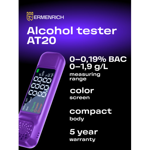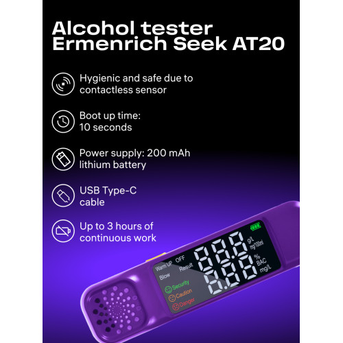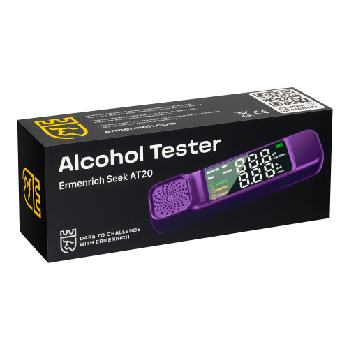 Алкотестер Ermenrich Seek AT20 подходит для проведения как самостоятельного, так и экспертного тестирования на количество алкоголя в выдыхаемом воздухе или в крови по выдыхаемому воздуху. Датчик, анализирующий степень опьянения, работает в диапазоне 0ndash0,19% BAC (laquoBlood Alcohol Concentrationraquo) или 0ndash1,9 г/л. Для корректного срабатывания алкотестера необходимо произвести выдох длительностью 10 секунд над приемной частью инструмента. От момента включения Ermenrich Seek AT20 до его laquoразогреваraquo также проходит всего 10 секунд ndash а это значит, что весь процесс тестирования не займет и минуты. Результаты анализа на наличие алкоголя в организме отображаются на ярком экране с простой и понятной индикацией.