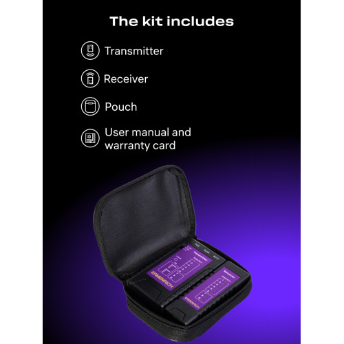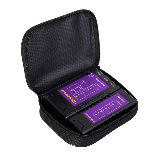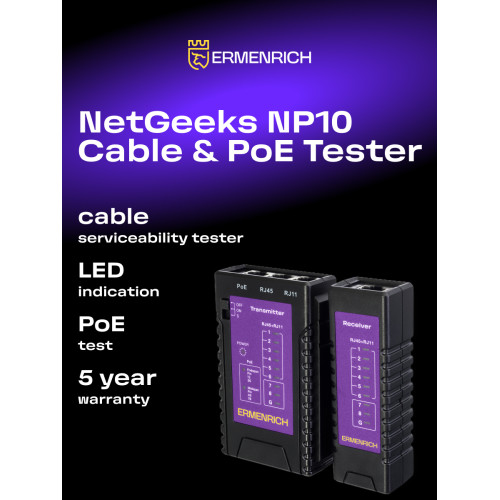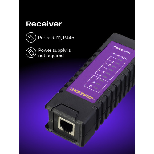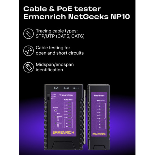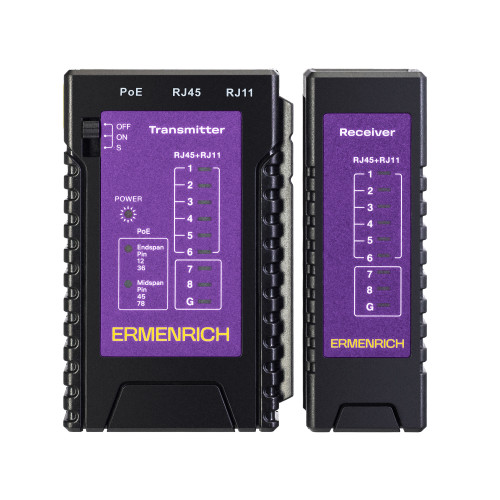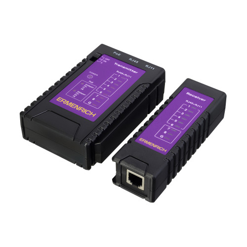 Состоит из двух отдельных устройств: передатчика и приемника. Передатчик оснащен индикаторной панелью и разъемами PoE, RJ11 и RJ45, питается от 1 батарейки 9 В (не входит в комплект). Приемник имеет 1 общий разъем RJ11/RJ45, не требует источника питания. Кабельный тестер будет полезен инженерам по монтажу и техническому обслуживанию IP-сетей, системным администраторам и другим специалистам по сетям Ethernet.
