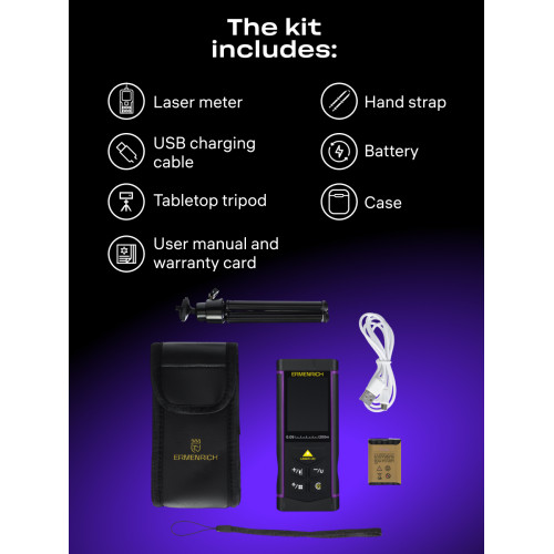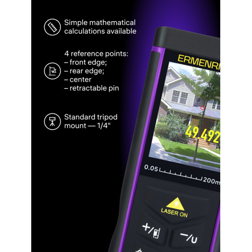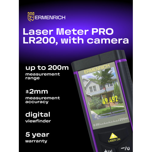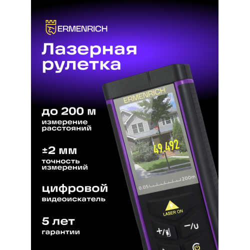 Ermenrich PRO LR200 ndash лазерная рулетка с цифровым видоискателем, которая позволит проводить замеры на удалении до 200 м. Прибор способен оценивать не только линейные расстояния, но и площадь, объемы и углы с минимальной погрешностью (plusmn2 мм). Оптимизация процесса измерений на стройке, при ремонте или проектировании с такой рулеткой выходит на новый уровень.