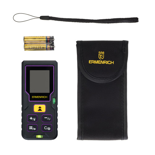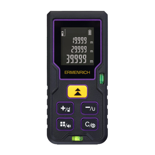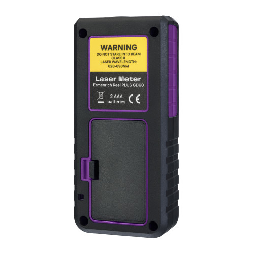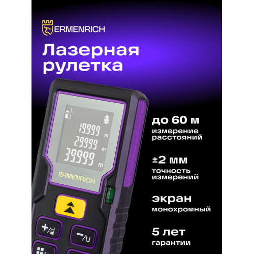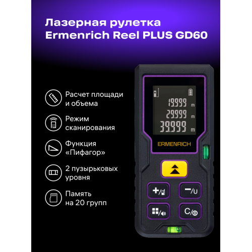 Ermenrich Reel PLUS GD60 – лазерная рулетка, рассчитанная на широкий спектр работ в строительстве, ремонте, на производстве и в кадастровом деле. Рулетку можно использовать для выяснения точных линейных размеров помещений и деталей, а также их площадей и объемов. Память устройства одновременно сохраняет до 20 групп данных. Для отображения результатов измерений и расчетов прибор снабжен ЖК-экраном с 3 отображаемыми строками. Также рулетка поддерживает функцию расчета параметров на основе данных промежуточных замеров, известную как функция «Пифагор».