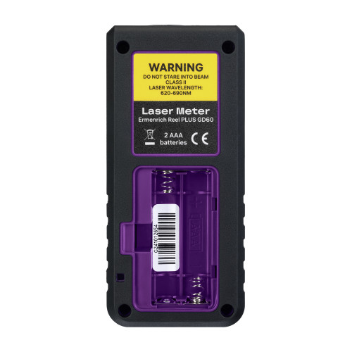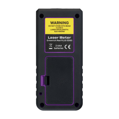 Измерения выполняются в ручном и автоматическом режимах. Легкий и эргономичный корпус лазерной рулетки Ermenrich Reel PLUS GD60 удобно удерживать одной рукой, что облегчает работу в сложных условиях. Для питания рулетки используются 2 батарейки типа ААА. Один комплект позволит провести более 5000 измерений. Для экономии энергии при длительном отсутствии замеров производится автоотключение лазера, а затем и самого устройства. Есть беззвучный режим.