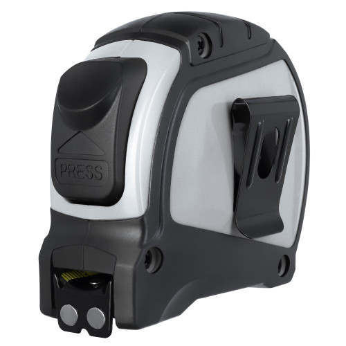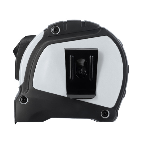 Матовая сталь, из которой изготовлено полотно, не восприимчиво к заломам и повреждениям. Корпус из высокопрочного пластика тоже долговечен. Для удобства ношения рулетка имеет поясное крепление.