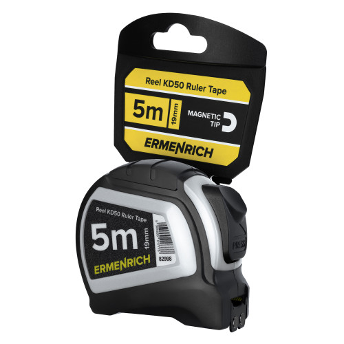 Рулетка Ermenrich Reel KD50 – необходимый инструмент при любых строительных, отделочных работах, в ремонте и ремеслах. 5-метровая односторонняя лента особенно удобна благодаря магнитному наконечнику с зацепом, который можно крепить на стальных поверхностях. Выдвинутое полотно рулетки автоматически фиксируется, чтобы свернуть его, достаточно нажать кнопку, эргономично расположенную на корпусе.