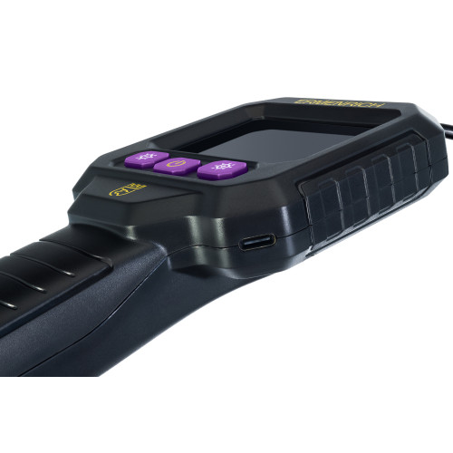 Конструкция состоит из самого прибора с экраном и удобной рукояткой, гибкого кабеля длиной 10 метров и камеры. Диаметр камеры ndash 8 мм, угол обзора - 70deg по горизонтали. Светодиодная подсветка позволяет работать в полной темноте. А влагозащищенность уровня IP67 предохраняет камеру от попадания пыли и воздействия влаги.